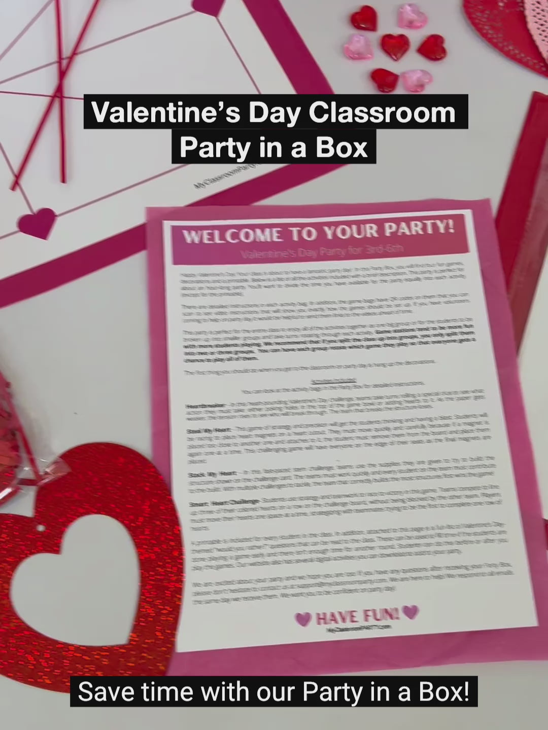 The Valentine's Day party games included can be played together as a whole class or can be played in small groups. A Party Box is recommended for a class size of 30 or less.