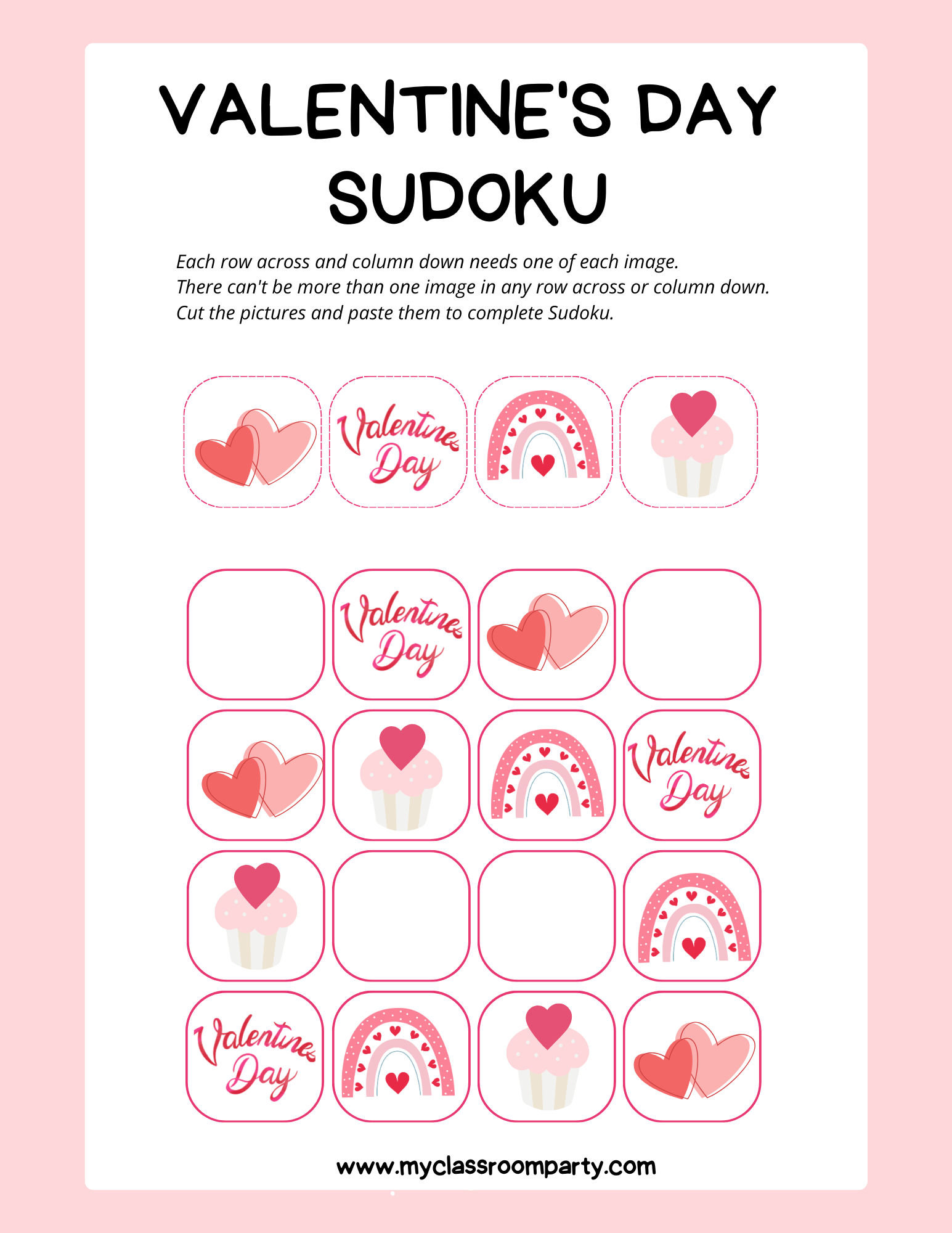 Help your class celebrate Valentine's Day with our free printable Soduku puzzle designed for elementary-age kids. Engage young minds with a fun Valentine's Day-themed challenge. Simply add it to your cart and checkout. It will be sent to your email. It asks for an address at checkout but it isn't used for anything so feel free to enter a fake one.