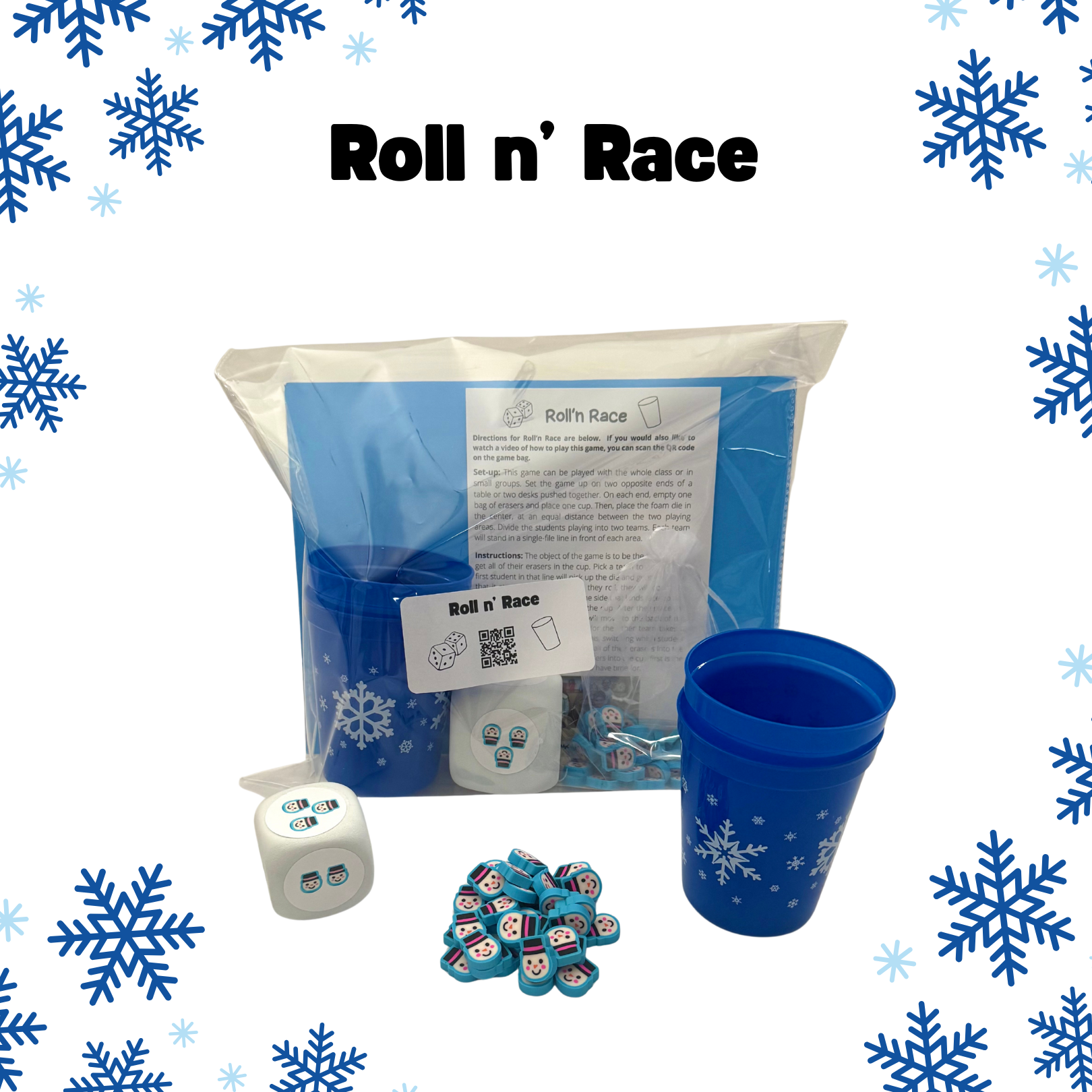 Roll n' Race - Roll, count, and race to the finish! In this fast-paced team challenge, players take turns using a jumbo die to add mystery numbers of erasers to their team’s cup. With every roll, the game gets more intense as teams compete to be the first to fill their cup. It’s all about quick thinking, teamwork, and a bit of luck! Perfect for classrooms or small groups, this game brings big energy with a fun twist each round.